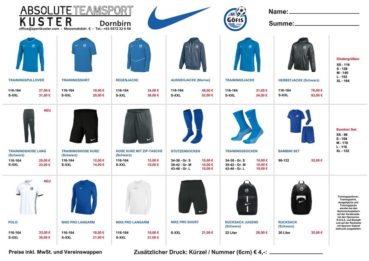 Folgende Produkte können bei Absolute Teamsport Kuster in Dornbirn erworben werden. Bitte bei Direktbestellung das Bestellformular ausfüllen.